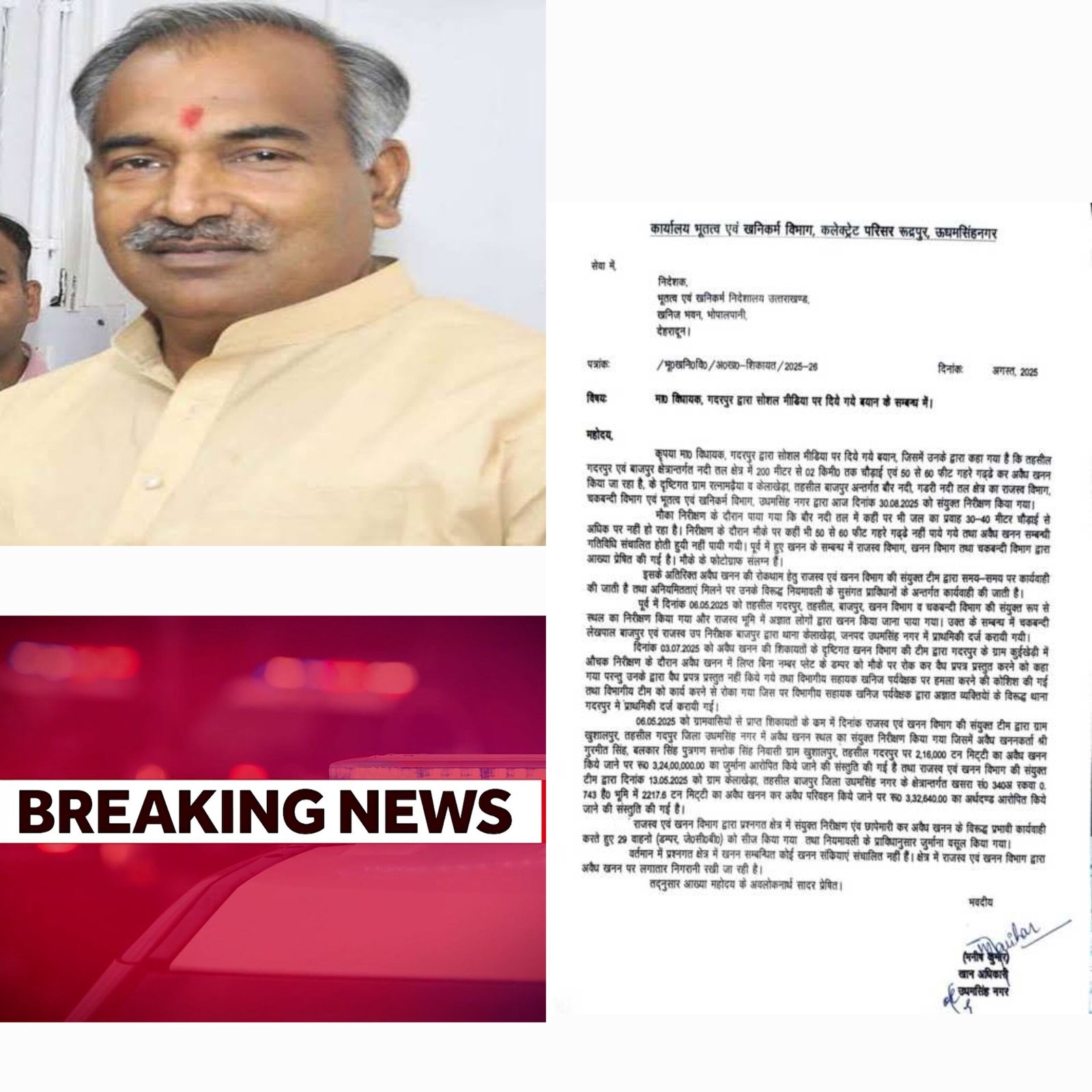 विधायक, गदरपुर अरविंद पांडे द्वारा सोशल मीडिया के माध्यम से तहसील गदरपुर एवं बाजपुर क्षेत्रान्तर्गत नदी तल क्षेत्रों में 200 मीटर से 02 किमी तक चौड़ाई एवं 50 से 60 फीट गहरे गड्ढे कर अवैध खनन किये जाने का आरोप लगाया गया है।