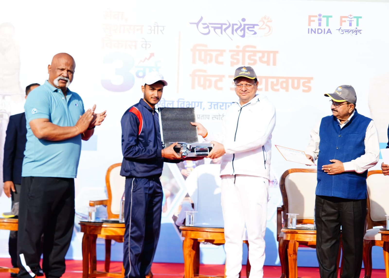 खिलाड़ियों के बीच पहुंचे मुख्यमंत्री ने पुश-अप्स लगाकर खिलाड़ियों का उत्साहवर्धन किया एवं उन्हें फिट रहने के लिए प्रेरित किया। मुख्यमंत्री ने खिलाड़ियों से मुलाकात कर, उन्हें फिट इंडिया की शपथ भी दिलवाई। मुख्यमंत्री ने उत्तराखंड युवा कल्याण विभाग के सहयोग से चलाए जा रहे ड्रोन कोर्स में सर्वश्रेष्ठ प्रदर्शन करने वाले युवाओं को ड्रोन भी वितरित किए।