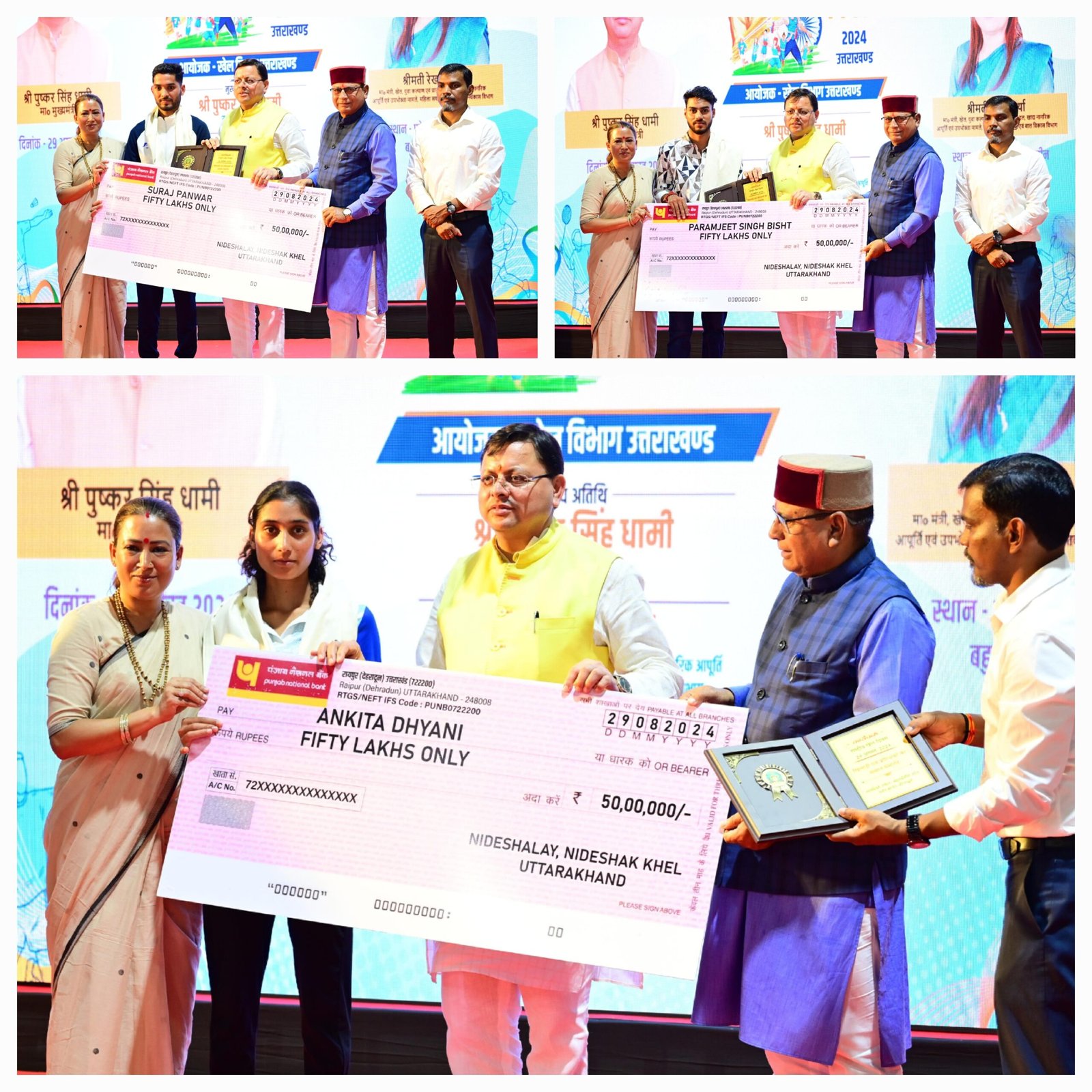 मुख्यमंत्री ने पेरिस ओलंपिक 2024 में प्रतिभाग करने वाले उत्तराखंड के 4 खिलाड़ियों ( लक्ष्य सेन, परमजीत सिंह, सूरज पंवार, अंकिता ध्यानी ) को 50 – 50 लाख की धनराशि के चेक प्रदान किये