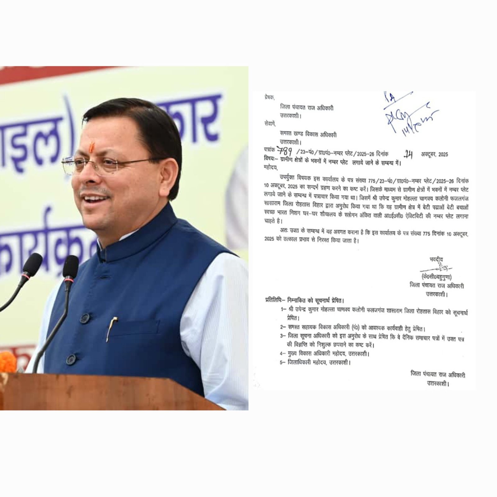 मुख्यमंत्री श्री पुष्कर सिंह धामी ने सोशल मीडिया पर वायरल हुए पत्र का संज्ञान लेते हुए जिला पंचायतराज अधिकारी, टिहरी गढ़वाल के आदेश को तत्काल प्रभाव से रद्द करने के साथ ही मामले की पूरी जांच कराने और दोषियों के खिलाफ आवश्यक कार्रवाई सुनिश्चित करने के निर्देश भी जारी किए हैं।