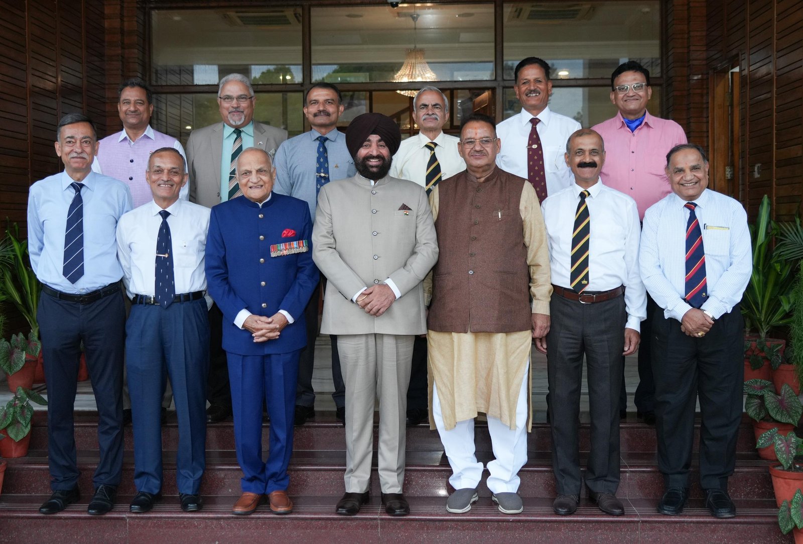 राजभवन में राज्यपाल लेफ्टिनेंट जनरल गुरमीत सिंह (से नि) के साथ पूर्व सैनिकों के कल्याण से संबंधित विभिन्न विषयों पर वार्ता करते सैनिक कल्याण मंत्री गणेश जोशी और सेवानिवृत सैन्य अधिकारीगण